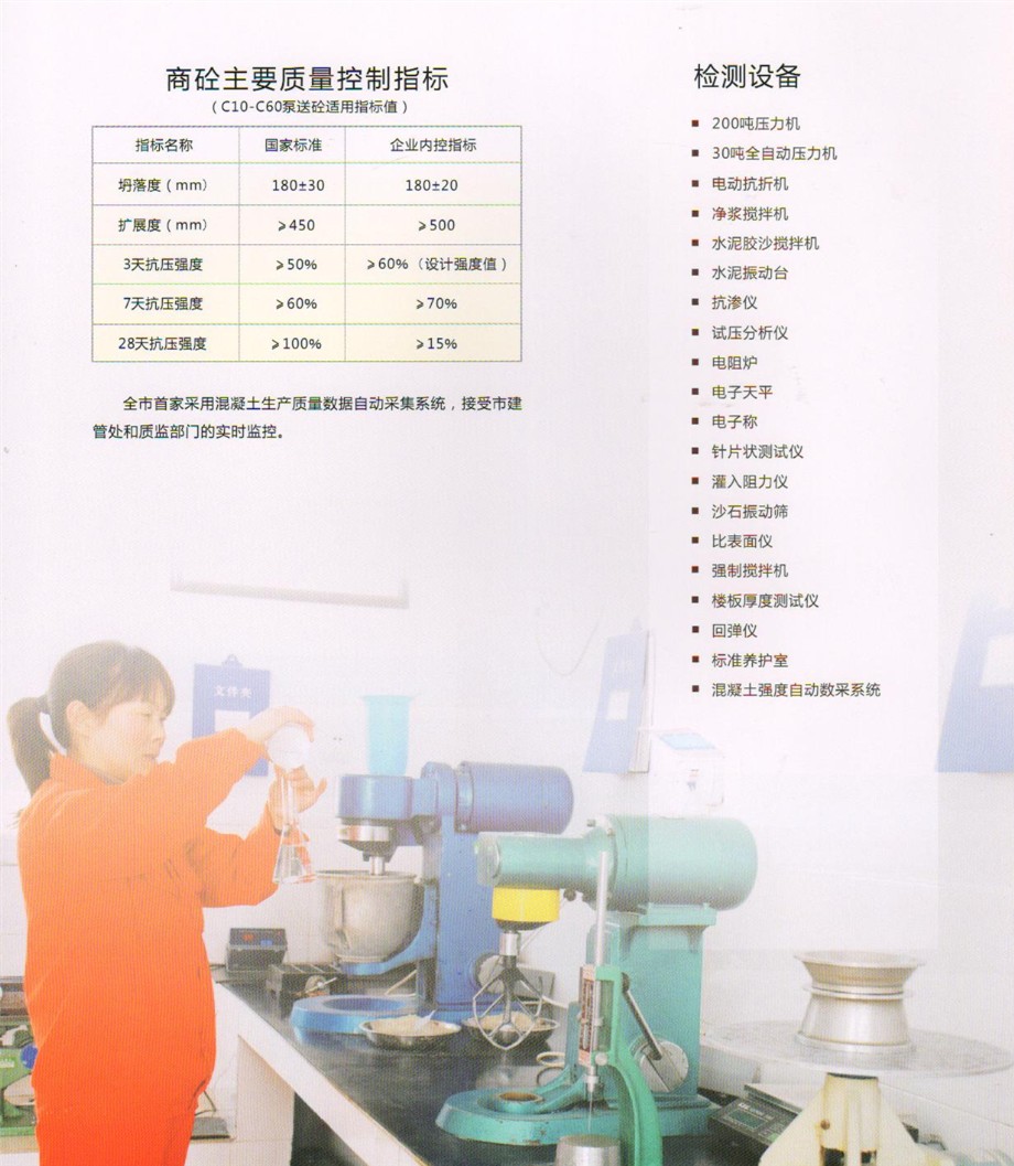公司設有先進的實驗室,配備全套混凝土及原材料檢測試驗設備,配有專職的試驗、檢驗人員,可承擔混凝土的材料性能試驗,工藝質(zhì)量控制、產(chǎn)品質(zhì)量檢驗等全部試驗、檢驗項目,為確保混凝土質(zhì)量提供了可靠的保證。